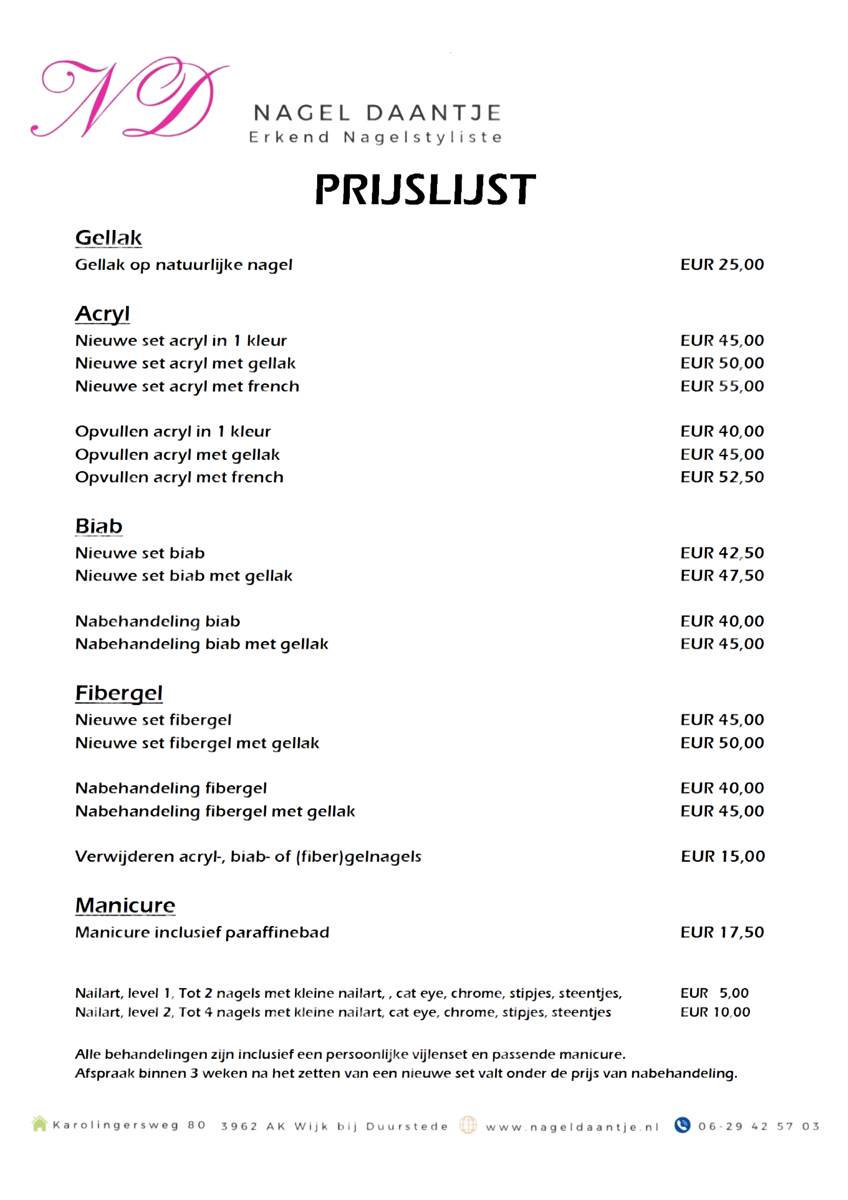 Bij Nagel Daantje bieden we een scala aan nagelbehandelingen, waaronder acryl, biab en gellak. Onze professionele nagelstyliste staat klaar om je te helpen bij het creëren van de perfecte nagels die passen bij jouw stijl en persoonlijkheid. Kom langs en ervaar de luxe van goed verzorgde nagels in een ontspannen omgeving.